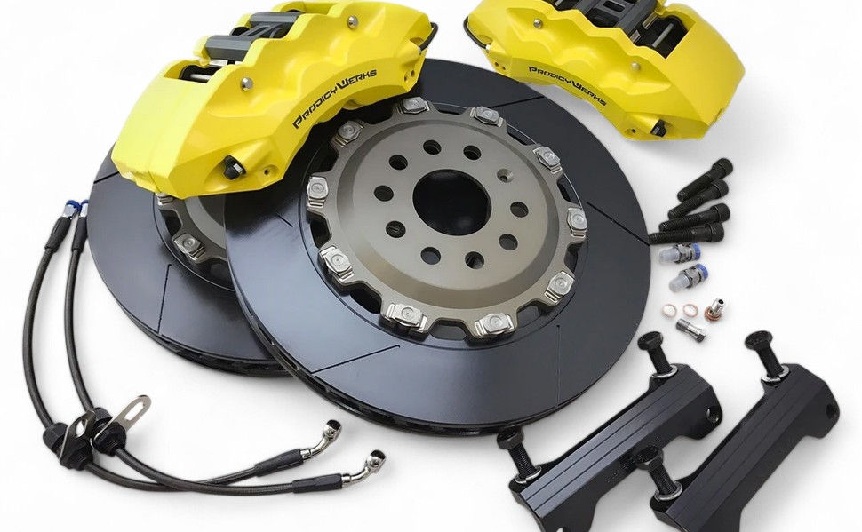 Our AD6 6-Piston Big Brake Kit currently match with our ProdigyWerks 2-piece design floating brake discs and comes in two different sizes, the 330mm x 32mm (13") and 356mm x 32mm (14"). We specifically work with the disc thickness of 32mm to better handle thermal stress during extreme driving conditions. We also have Carbon Ceramic Floating Discs kit options to match with our AD6 6-Piston Caliper with the disc size of 380mm and 390mm. Our Carbon Ceramic Floating disc assembly each only weights approx. 5.50kg to 6.50kg each. For more information, see Carbon Ceramic Brake Discs or visit our Carbon Ceramic Floating Brake Discs page.